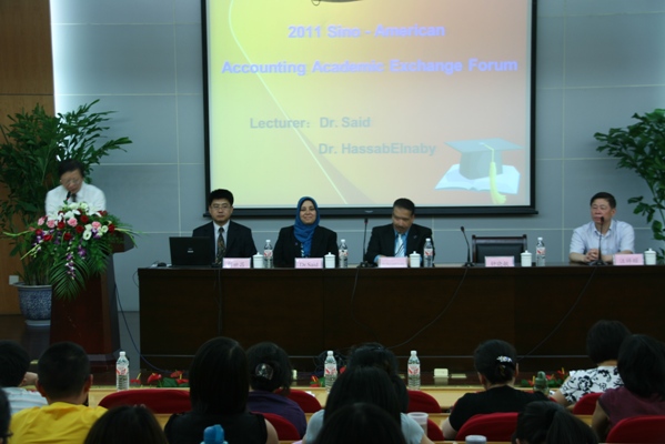 论坛由会计学院院长汪祥耀教授主持。副院长钟晓敏教授到会并用英文发表精彩的开幕讲话。钟副院长首先对前来参加本次论坛的嘉宾表示欢迎,接着简要介绍了我校与UT的合作背景以及包括中美本硕联读班、外派教师赴美国进修、学术交流等方面的主要合作内容和具体开展情况。钟副院长强调,两校之间的密切交流,是我校师资、学生和学术国际化的榜样。同时,学校将一如继往地支持两校之间的合作项目,并希望不断拓展交流与合作的广度和深度。最后,钟副院长代表学校向UT的 Amal Said和Hassan R. HassabElnaby两位教授来我校进行学术交流表示衷心的感谢,并希望今后的中美会计学术论坛越办越好。