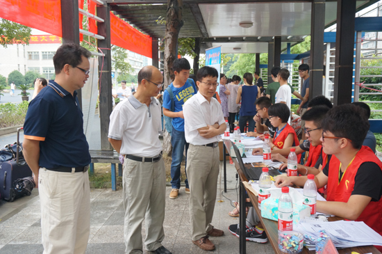 9月11日,我校文化长廊迎新现场热闹非凡,随处都能听见迎新老师和学生与2014级新生的温情对话,前来报到的学生在各学院指定的区域办理各项报到程序。副校长卢新波来到迎新现场,与新生、家长亲切交流,叮嘱迎新工作人员要耐心细致地做好各项服务工作。