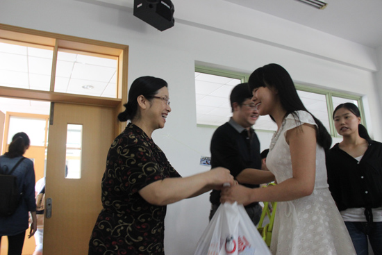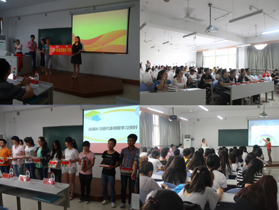 自强补习班2013级学员、2014级班主任助理肖群同学首先介绍了自强补习班的基本情况,在自强补习班,学员们互相帮忙,学习知识,锻炼能力,建立自信。随后,学生处和校团委相关负责人向2014级自强补习班的学员送上学习资料和学习用品。