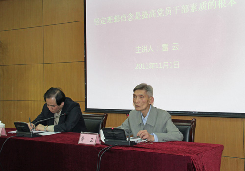 雷云同志的报告以“坚定理想信念是提高党员干部素质的根本”为主题,先后从党员的理想信念来自于什么、为什么要坚定理想信念、怎样建立理想信念等三个方面向大家作了详细阐述,并以自己的亲身经历诠释了一个共产党员应该如何确立正确的人生观、世界观和价值观,他的语调亲切而缓慢,以一个长者的姿态与大家谈心,感人至深,引人思考。