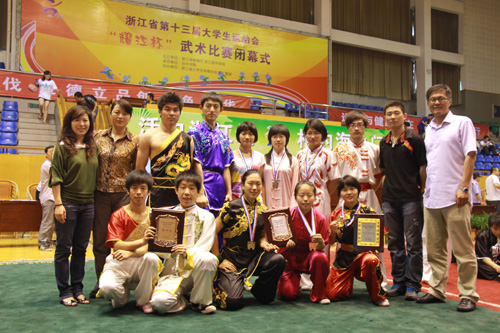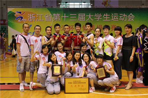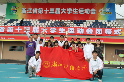 浙江省第十三届大运会共设田径、游泳、篮球、排球、足球、武术、健美操、乒乓球、羽毛球、网球、定向运动11个比赛项目,自2010年4月开始,历经近一年半时间,我校运动队参加了全部项目的比赛。在学校领导的高度重视和大力支持下,在相关部门和老师的努力配合下,全体教练员和运动员瞄准奋斗目标,坚持常年训练;讲求科学施训,提高技术水平;发扬顽强作风,秉承体育精神;加强队伍建设,追求项目贡献。每一单项的运动健儿与来自全省高校的运动员们在公平、公正的环境里同场竞技,奋勇拼搏,超越自我,捷报频传,创下了我校参加全省大学生运动会以来最好成绩,以团体总分594分名列全省本科院校第三,共获奖牌41枚,其中金牌11枚,银牌16枚,铜牌14枚;有12人次获“优秀运动员”称号;有8人次获“优秀教练员”称号;有7个项目获“单项体育道德风尚奖”;同时获得大运会的“综合体育道德风尚奖”,取得竞赛成绩和精神文明双丰收,并出色完成了大运会预定目标,也标志着我校竞技体育达到省内高校领先水平。