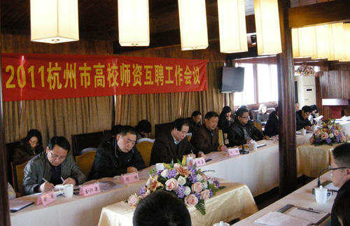 近日,由我校承办的2011年杭州市区高校师资互聘工作会议在杭州举行,浙江省教育厅高教处处长顾玮、金仁康副处长、侯蔚以及来自杭州地区三十多所高校的教务处负责人和相关工作人员共近60人参加了会议。王俊豪院长出席了会议,教务处处长沃健主持会议。