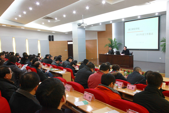 韩翼祥书记在会上强调,今年是学校全面落实“十二五”发展规划的重要一年,是学校申报大学建制的关键一年,为进一步扎实做好学校2012年度各项任务,提出四点要求:一是进一步加强领导班子和中层干部队伍建设,努力提高干部领导学校科学发展的能力水平。要求中层干部增强学习的自觉性,充分发扬开拓创新精神,保持开放、进取、务实的精神状态,做好中层干部新一轮换届工作,加大干部教育、培训和管理力度。二是深入研究学校改革与发展中存在的薄弱环节,努力推进学校各项工作跃上新台阶。要不断加强人才队伍建设,加快实施“高层次人才引进计划”。不断提高人才培养质量,完善具有我校特色的人才培养模式。加强学科与学位点建设,构筑学科高地。围绕浙江经济社会发展战略需求,抓科研平台建设。三是以改革促发展,深入推进校院二级管理体制改革,不断激活校院两级办学活力。要主动适应高等教育发展规律和浙江经济社会发展需要,提高办学效益、增强办学活力。进一步理顺学校后勤管理体制,加大后勤改革力度。四是加强宣传思想文化建设,努力营造和谐稳定的校园环境。进一步推进文化建设,深入开展主题教育活动,提升师生理想抱负水平,继续关心师生学习与生活,关注师生身心健康。