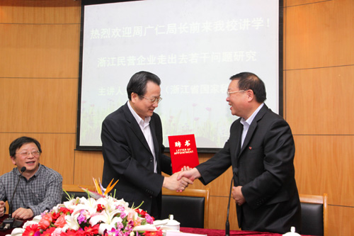 5月10日上午,浙江省国税局局长周广仁应邀来我校作了“浙江民营企业走出去若干问题研究”专题报告,校党委书记韩翼祥代表学校向周广仁局长颁发兼职教授、兼职硕士生导师聘书。报告会由钟晓敏副院长主持。
