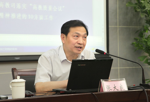 张大良司长首先介绍了全面提高高等教育质量工作会议的基本情况,传达了国务委员刘延东同志和教育部部长袁贵仁同志的重要讲话精神。对研究制定《关于全面提高高等教育质量的若干意见》和《关于实施高等学校创新能力提升计划的意见》的相关背景和内容进行了分析。他从5月11日《人民日报》刊登的十年来教育改革大事记切入,深刻地剖析了目前影响和制约高等教育质量提升的6个突出问题。随后,张司长从提升内涵发展、提高人才培养质量、健全教育质量评估制度、加强创新引领、深化机制体制改革、加强对外交流与合作、建设高素质教师队伍、加强高校基础建设和经费保障等8个方面,对“提高质量30条”文件中提出的政策和主要措施进行了全面深刻的解读。