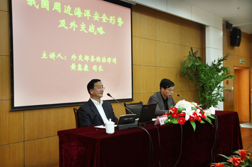 在两个多小时的报告中,黄惠康司长介绍了我国当前的国际形势、我国外交的基本理念和战略境遇,回顾了我国外交的巨大成就,着重分析了当前我国的海洋环境,海洋维权的总体形势和海洋发展战略,并对师生关注的中日钓鱼岛问题、中菲黄岩岛问题的由来和我国政府采取的应对举措作出了解析。黄惠康司长指出,我国周边海洋问题敏感而复杂,我们正处于和平发展的重要战略机遇期,在处理包括黄岩岛事件在内的周边海洋问题时,一定要继续坚持中央既定方针,既要坚定、有效地捍卫国家主权和海洋权益,又要统筹兼顾当前利益和长远利益、局部利益和整体利益,发挥高超的政治智慧,运用娴熟的政策策略,讲究斗争的方式方法,为我国争取最好的结果和最大的利益。