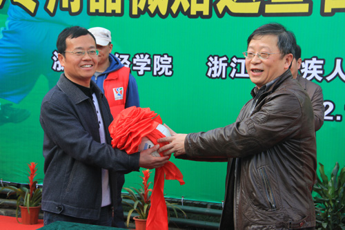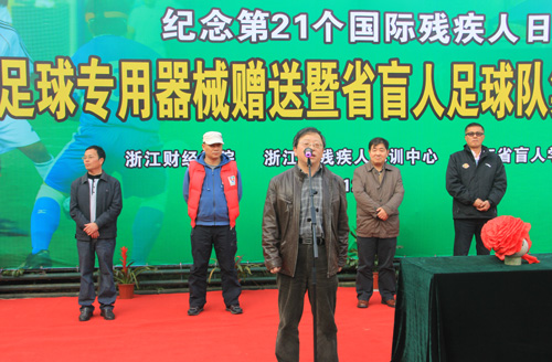 仪式上,省残联宣文部副部长、省残疾人体训中心副主任潘国新上台致辞,他表示浙江财经学院带着对我省残疾人运动员的深情厚谊,向盲人学校捐赠价值不菲的训练器材和挡板,是一个充满人道主义精神的善举,他代表省残疾人体育训练指导中心和省盲人足球队向我校表示感谢和敬意。