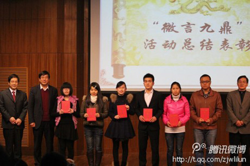 “微言九鼎—— 信仰照亮青春”微博活动(http://e.t.qq.com/zjwlilun)由浙江省委宣传部、浙江在线新闻网站主办。比赛设“微观点”、“微映像”及“微征文”三个板块,各评出一等奖2名、二等奖和三等奖6名。我校暑期社会实践团队以扎实的作风、显著的成效,荣获活动最高奖,体现了我校学子的良好精神风貌。