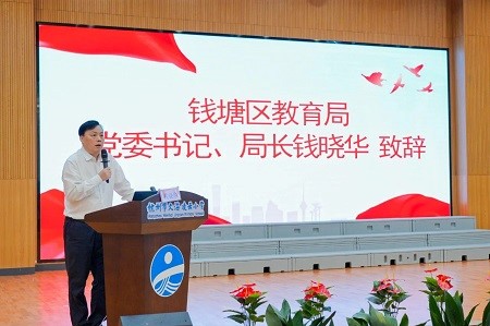 本网讯10月17日,学校与钱塘区教育局在杭州市文海凌云小学联合举办大中小幼思政教育一体化建设推进会暨十月开放式主题党日活动。校党委书记李金昌,钱塘新区管委会副主任、钱塘区副区长潘伟红,钱塘区教育局党委书记、局长钱晓华出席会议。