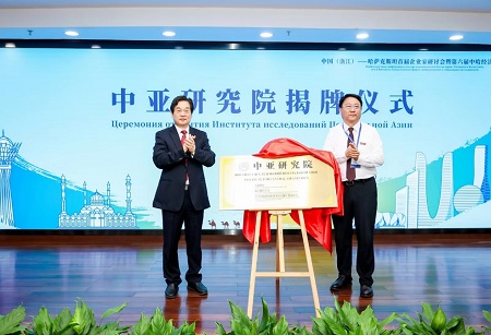 李占荣与葛学斌共同为中亚研究院揭牌。该研究院由我校与浙江省贸促会合作共建,致力于打造中亚经贸问题研究的“高端智库”,推动浙江省以及长三角地区的“一带一路”国际化战略。论坛还成立了中国(浙江)-哈萨克斯坦企业家产学研合作联盟,学校作为秘书长单位。
