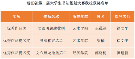 本网讯日前,浙江省书法家协会公布了浙江省第二届大学生书法篆刻大赛获奖、入展名单。学校12位同学榜上有名,获奖、入展人数名列全省前茅。王晟达同学书法作品荣获优秀作品奖,梁楠、邵晓柯获优秀作品提名奖,巫子怡、卢果、鲍飞毓、沈柯吟、郭宗律、宋天扬、蒋心宇、张心怡、任来贺获入展奖,黄建新、徐文平、周寒筠老师荣获优秀指导教师奖,学校获优秀组织奖。