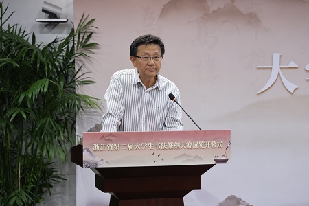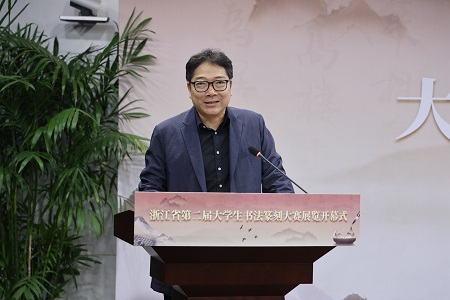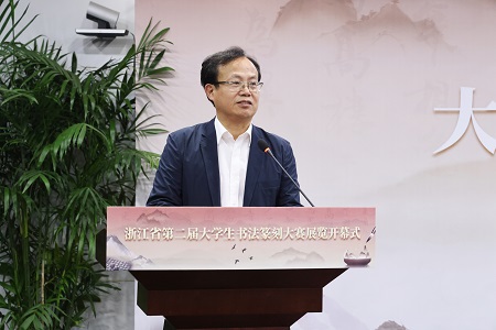 何涤非致辞,他代表浙江省书法家协会,对学校承办本次活动以及为浙江书法事业作出的积极贡献表示衷心感谢。他表示,文化兴则国运兴,文化强则民族强,要擦亮浙江省大学生书法篆刻大赛金名片,在以“两个先行”打造“重要窗口”的奋进路上,展现浙江文艺担当,贡献青年书法力量。并希望青年大学生始终坚持以人民为中心的创作导向,树立向人民学习、为人民创作的远大志向,夯实传统根基,开创古法新用、法为我用的时代新风,肩负起当代书法可持续发展的历史使命。