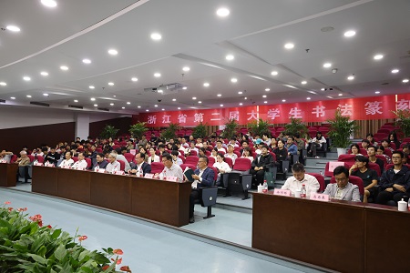 本网讯10月31日,浙江省第二届大学生书法篆刻大赛展览开幕式在我校隆重举行。浙江省文联副主席、浙江省书协主席赵雁君,ued体育 党委书记李金昌,浙江省书协副主席、秘书长何涤非,省书协主席团成员、教育委员会副主任江吟,省书协教育委员会副主任、省高教学会艺术教育分会秘书长夏一鹏,省书协教育委员会副主任王泽玖、薛平、边宏、徐同林,副秘书长高甬春,ued体育 党委副书记黄建新,党委委员、组织部、宣传部、统战部部长楼胆群以及来自全省各高校获奖师生代表出席本次活动。开幕式由浙江省书协主席团成员、教育委员会秘书长、浙江美术馆副馆长黄寿耀主持。