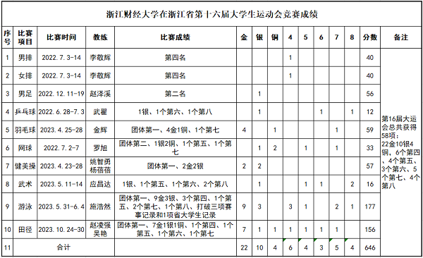 本届大运会自去年5月开赛至今,共设置了10大项。学校参加了全部比赛项目,相继取得了羽毛球比赛、健美操比赛、游泳比赛、田径比赛团体总分第一名,足球比赛、网球比赛团体总分第二名以及排球比赛第四名等多项佳绩。