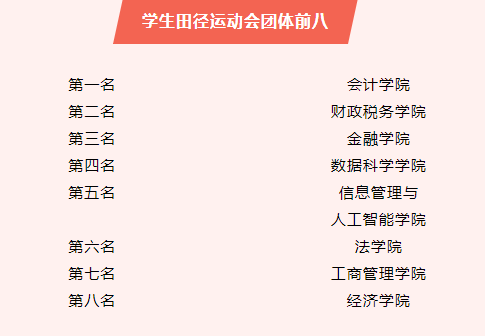 本届运动会4次打破校运会纪录,来自财税学院的俞凌云同学以10分06秒11的成绩打破男子3000米校纪录;来自会计学院的胡冰艺、吴棋凡、唐逸飞、许硕果同学以50秒51的成绩打破男女混合4x100接力校纪录;来自研究生院的韩箴以15秒02的成绩打破男子110米栏校纪录,同时以2805分打破男子五项全能校纪录。在刚刚结束的中华人民共和国第一届学生(青年)运动会田径比赛中,来自法学院的研究生陈舒昂以51秒89的成绩打破男子400米栏的校纪录,并取得了该项目全国第六名。同时还代表浙江队获得男子乙组4x400米接力的亚军,为浙江省、为我校赢得了荣誉。