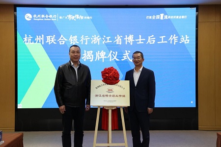 本网讯11月16日,学校与杭州联合银行共建博士后工作站揭牌仪式在杭州联合银行总部大楼举行。杭州市人社局党组书记、局长董悦,专技处处长倪东,校党委书记李金昌,杭州联合银行董事长张海林,行长闻渊,浙江大学公共政策研究院执行院长、浙江省特级专家金雪军出席揭牌仪式。