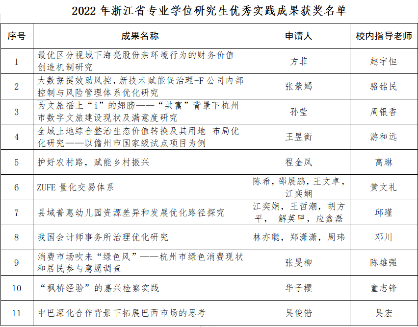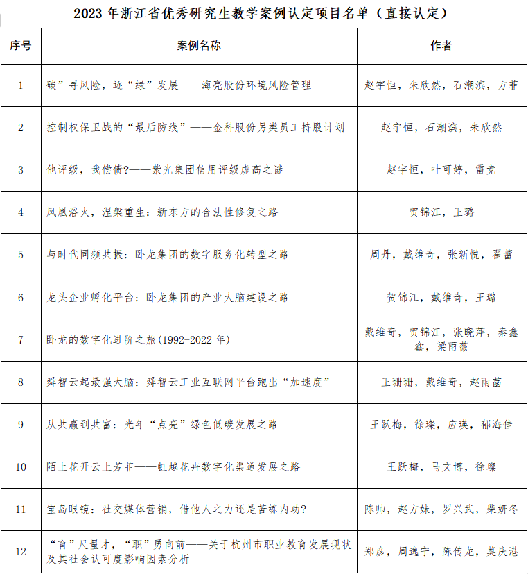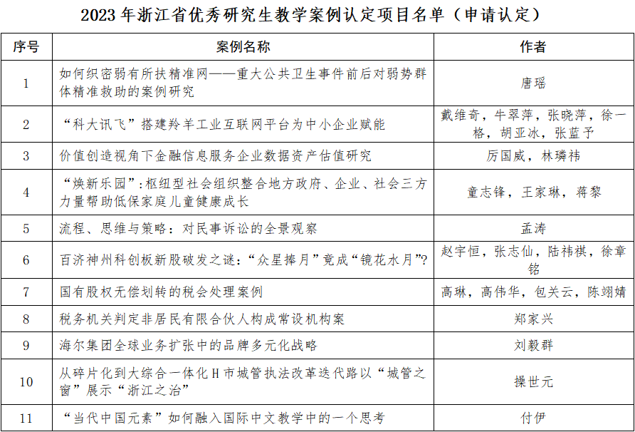 浙江省研究生优秀教学案例认定及专业学位研究生优秀实践成果认定是浙江省研究生教育学会为推动我省研究生教育的改革与发展、提高专业学位研究生培养质量而开展的工作,学校将继续加强高质量研究生教育建设工作,不断提高研究生教育水平和管理水平。