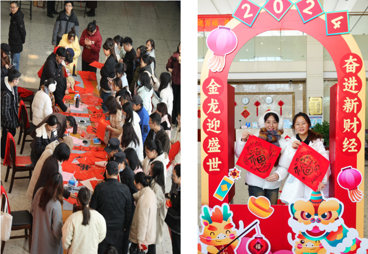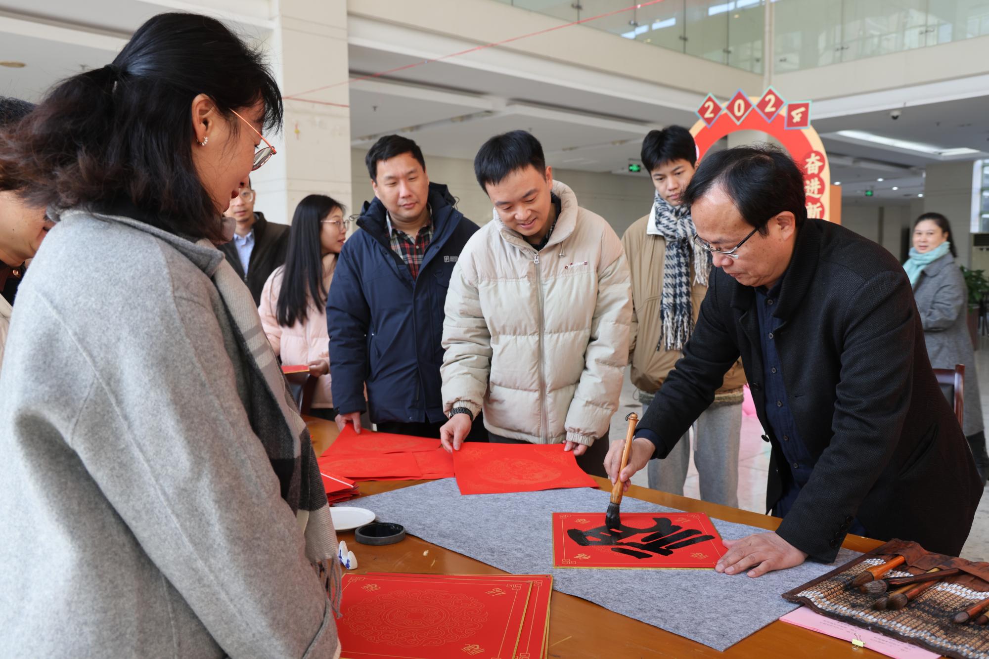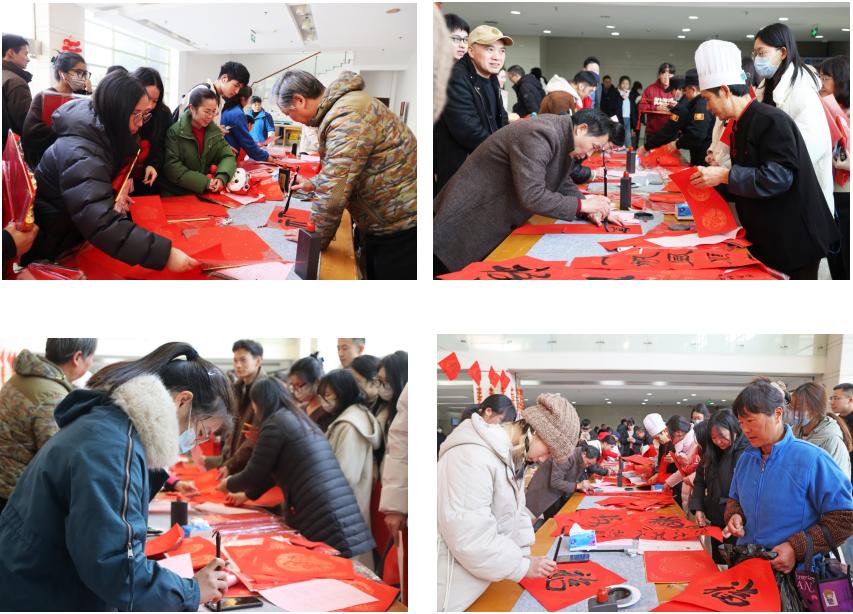 活动现场,人头攒动,热闹非凡,前来参加活动的师生员工络绎不绝。校领导与10余位离退休老同志、师生书法爱好者,现场挥毫泼墨,潜心创作。一副副喜庆吉祥、满载祝福的对联随笔尖流动而出,一张张红红火火的“福”字在手上传递,师生们边欣赏、边讨论,围在一旁领略书法魅力,整个活动洋溢着节日的喜庆气氛,荡漾着墨汁的扑鼻芳香。活动累计送出春联2500余副,“福”字3500余个,以及中国结、红辣椒、红灯笼、红鞭炮、福袋等各类年俗节庆用品。