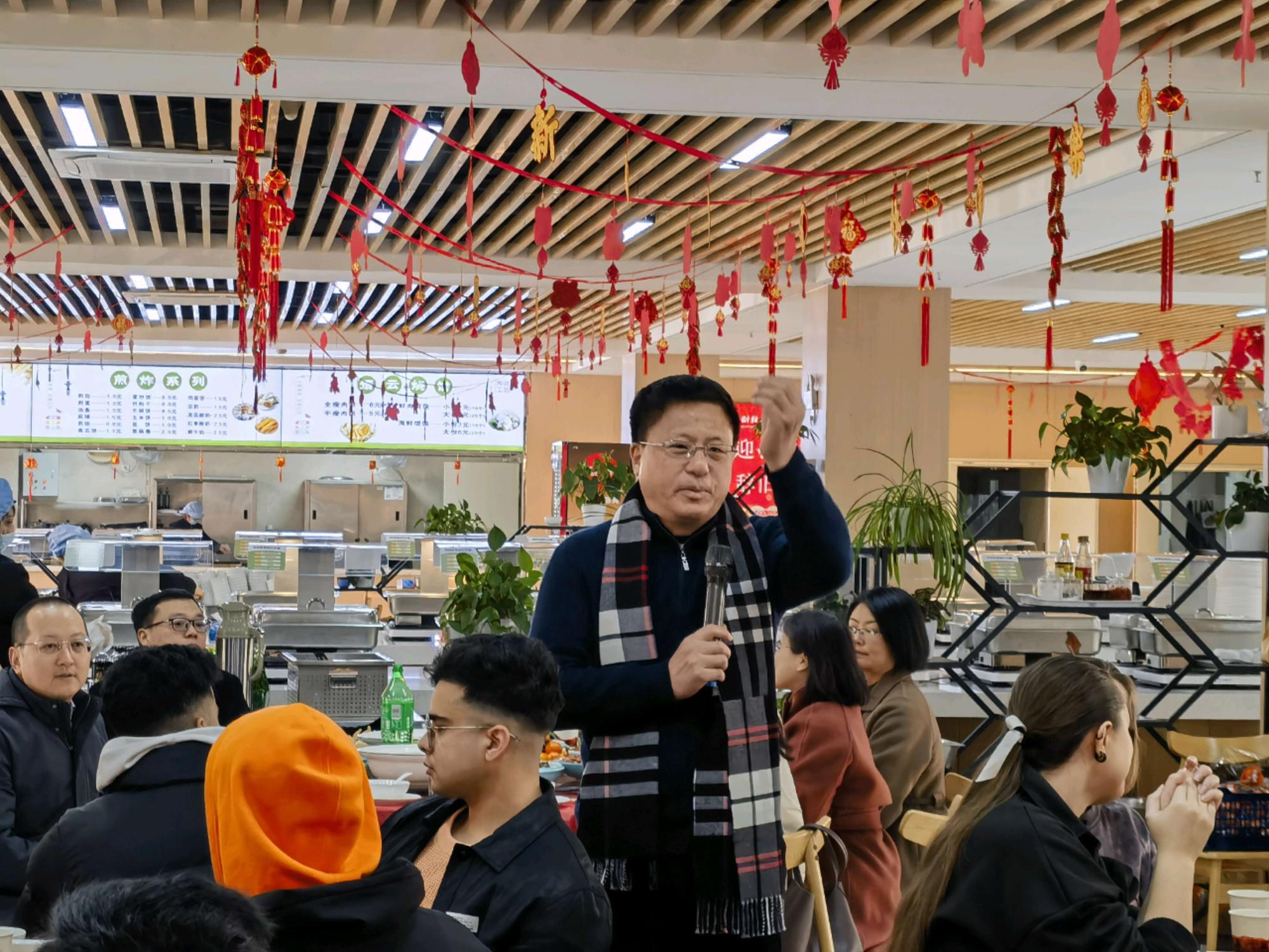 魏江代表学校向春节期间留校的同学和教职工们拜年,他表示,在过去的2023年,学校在各方面都取得了优异成绩,成绩的取得离不开全校师生员工的共同努力。希望同学们充分利用好假期的宝贵时间提升自我,注意劳逸结合并不忘和家人常联系。希望国际学生更好更快融入浙财大家庭,成为中外文化交流桥梁和使者。希望大家在新的一年里继续为践行“新财经战略”贡献自己的光与热。