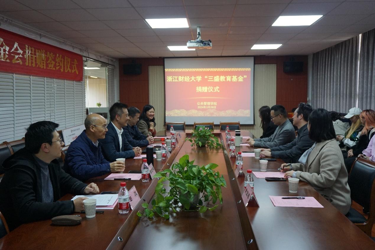 捐赠仪式上,校友办、公共管理学院和三盛教育科技有限公司共同签署捐赠协议,公管学院名誉院长代表学校接受捐赠支票,校友办负责人为三盛教育颁发捐赠证书、纪念杯,公管学院党委书记颁发聘书。