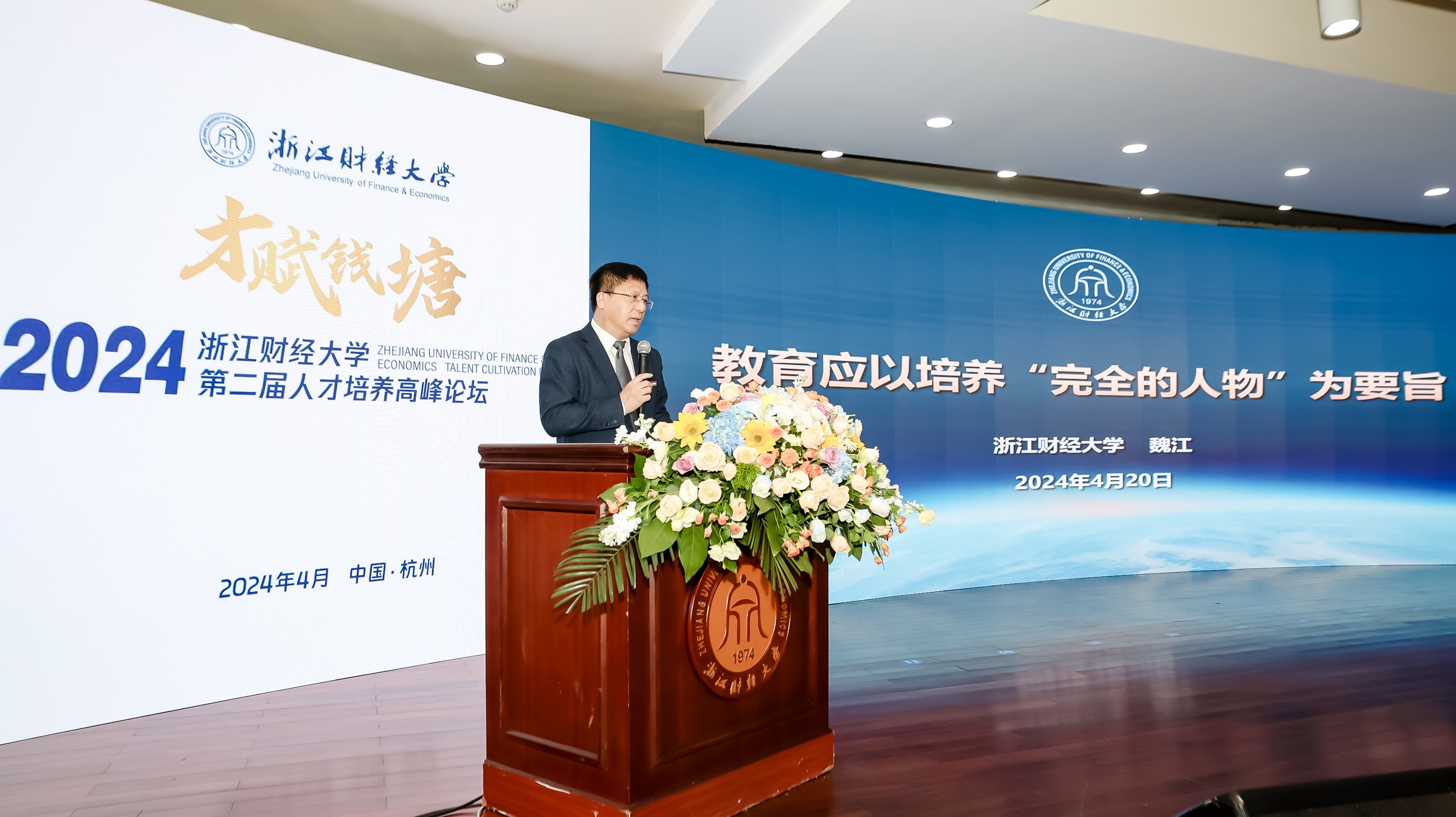 校党委副书记、副校长(主持日常行政工作)魏江教授作题为“教育应以培养‘完全的人物’为要旨”的主旨报告。他从“财大未来是什么样的大学”“财大培养什么样的人”“财大怎样培养人”这三个方面对教育应以培养“完全的人物”为要旨这一主题进行了解读。他指出要深入实施“新财经战略”,通过开辟“跳出财经,发展财经”的新路径,打破学科边界、学院边界和学校边界,打造没有边界、全面融合的培养平台,构建充满活力、开放创新的教育生态、以新培养体系育“浙财金生”——MAQ 型人才,为学生20年之后全面赋能。