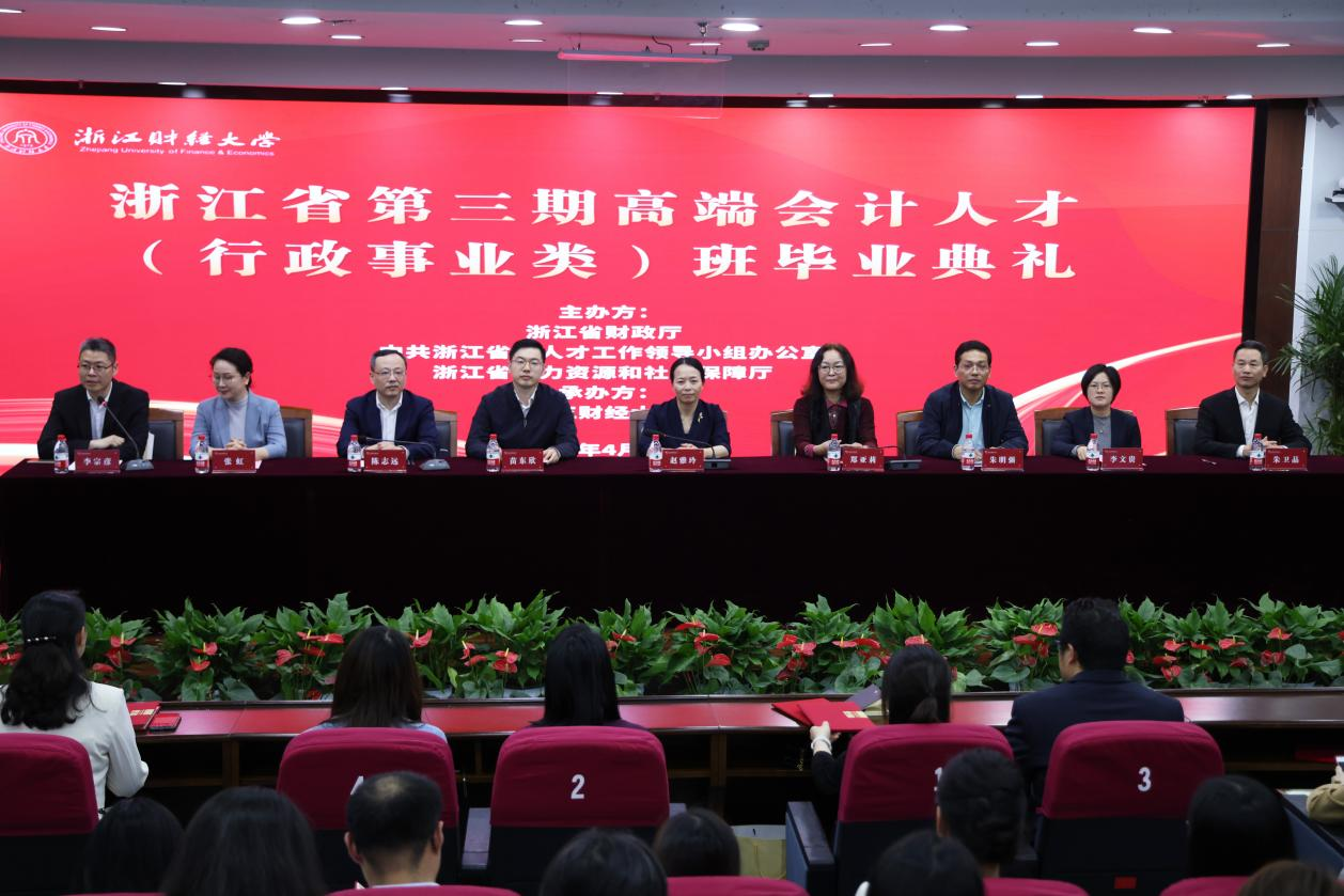 本网讯4月27日,浙江省第三期高端会计人才(行政事业类)培养项目毕业典礼在我校下沙校区举行。省财政厅党组成员、总会计师赵雅玲,副校长郑亚莉,省委组织部人才办二级主任科员苗东欣,省人力社保厅专技处二级调研员朱明强,省财政厅会计处处长陈志远、副处长朱卫品,会计学院负责人等出席活动。