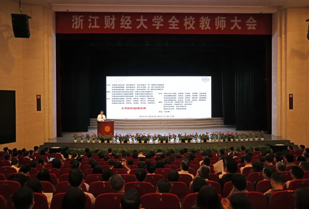 校党委副书记、副校长(主持行政日常工作)魏江以大学精神之问开篇,从“新财经战略”的实施背景、战略基础、学校现存的问题和短板,以及未来的愿景使命、主要任务进行了详细的阐述,进一步深化了全体教师对“新财经战略”的认识,为下一阶段学校工作指明了方向。魏江强调,当前,我国高等教育正处在以中国式现代化全面推进中华民族伟大复兴的新征程上,全球竞争格局深刻变化、国际国内形势发展都给财经学科建设提出新要求。全体教师要心怀“国之大者”,清楚认识浙财在扎根浙江、服务国家、嵌入全球三层次导向的战略使命感和责任感,破除思维定势,跳出财经、发展财经。要立足浙江,聚焦浙江经济社会发展实际、省委省政府重大战略需求,主动参与、积极融入。要加快构建中国特色、浙财风格的哲学社会科学自主知识体系,形成中国特色、浙财风格的学术体系、学科体系和话语体系,努力讲好中国故事、发出浙财声音,以“抓铁有痕、踏石留印”之魄力,在浙江土地上写下浙财人不可磨灭的贡献。