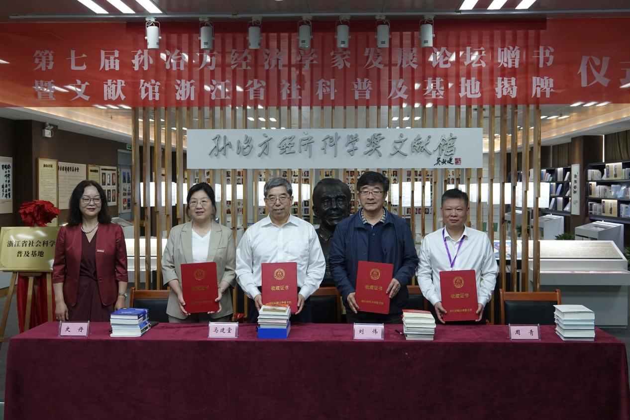 论坛期间,周济与郑亚莉共同为“两奖”文献馆“浙江省社会科学普及基地”揭牌。刘伟、史丹、沈坤荣接受学校“孙冶方经济科学奖与中国经济发展”通识课顾问聘书。马建堂、刘伟、史丹、沈坤荣、周青向文献馆捐赠签名著作。