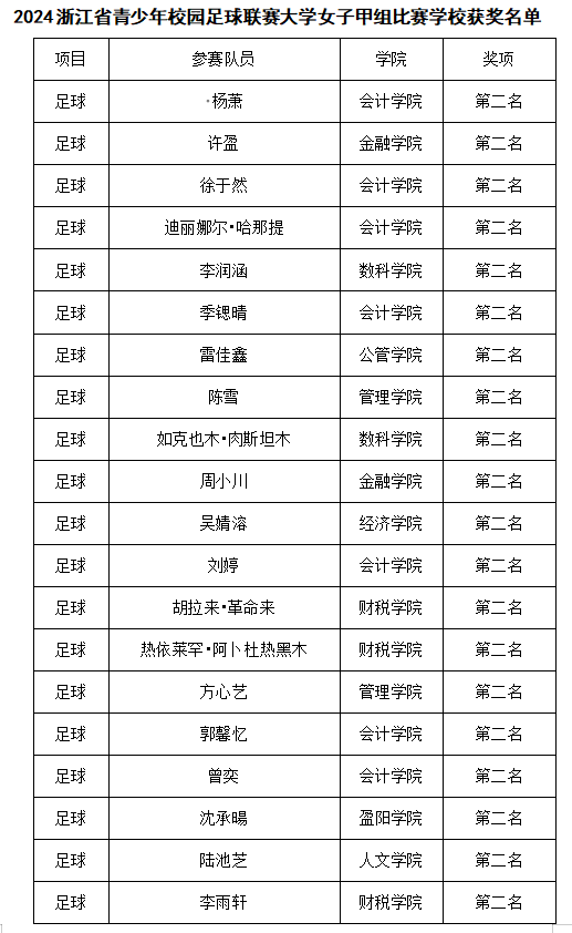 本网讯5月7日至13日,2024年浙江省青少年校园足球联赛大学女子组比赛(甲乙组)在湖州市举行。我校女足队员取得团体亚军的历史性佳绩。杜思雨获得“优秀教练员”称号,徐于然获得“最佳守门员”称号,周小川、如克也木•肉斯坦木、迪丽娜尔•哈那提、季锶晴获得“优秀运动员”称号。