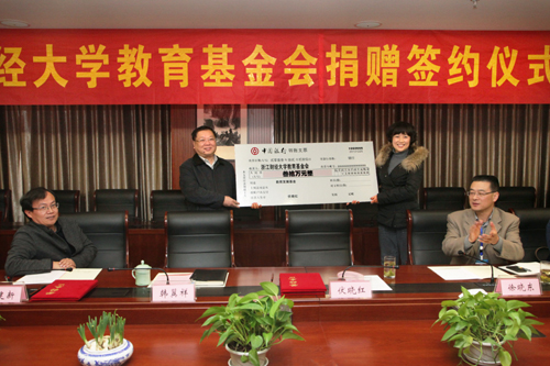 韩翼祥代表学校接受了捐赠者伏晓红的捐赠支票。黄建新代表学校与捐赠者签署了捐赠协议,并为捐赠者颁发了捐赠证书和纪念杯。