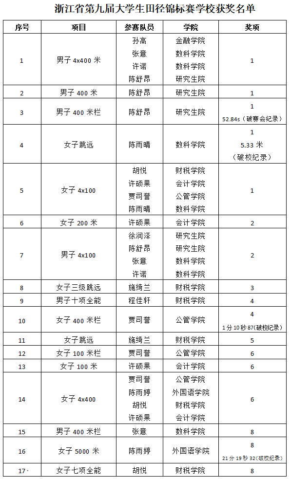 本网讯5月23日至27日,浙江省第九届大学生田径锦标赛比赛在温州举行。学校运动健儿奋勇拼搏,表现优异,喜获佳绩。