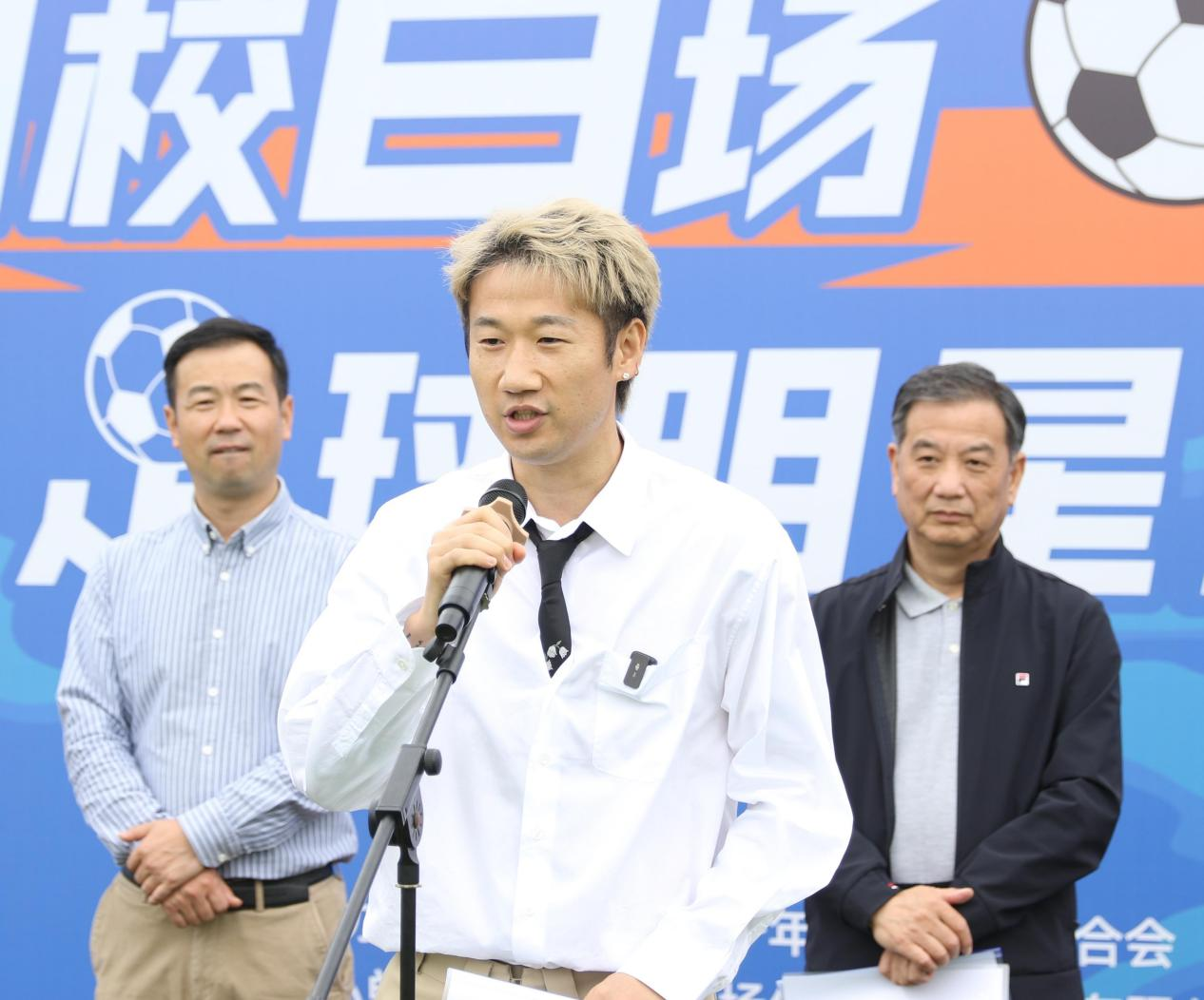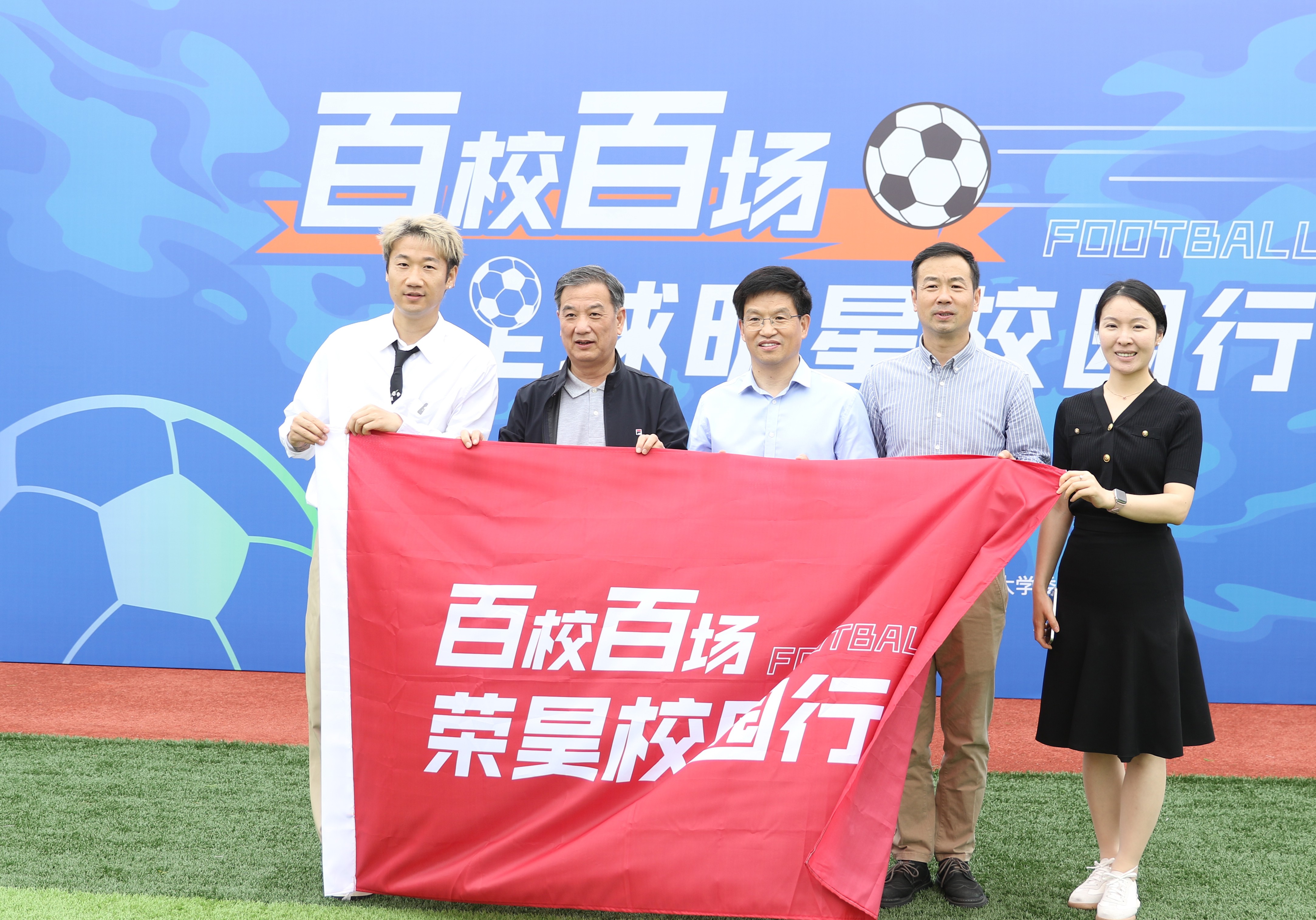 荣昊表示,作为前职业足球运动员,他将积极传播足球文化和技能,让更多的人去看足球、踢足球、学足球。鲍学军向荣昊授旗,标志着“2024百校百场足球明星校园行”活动正式开启。