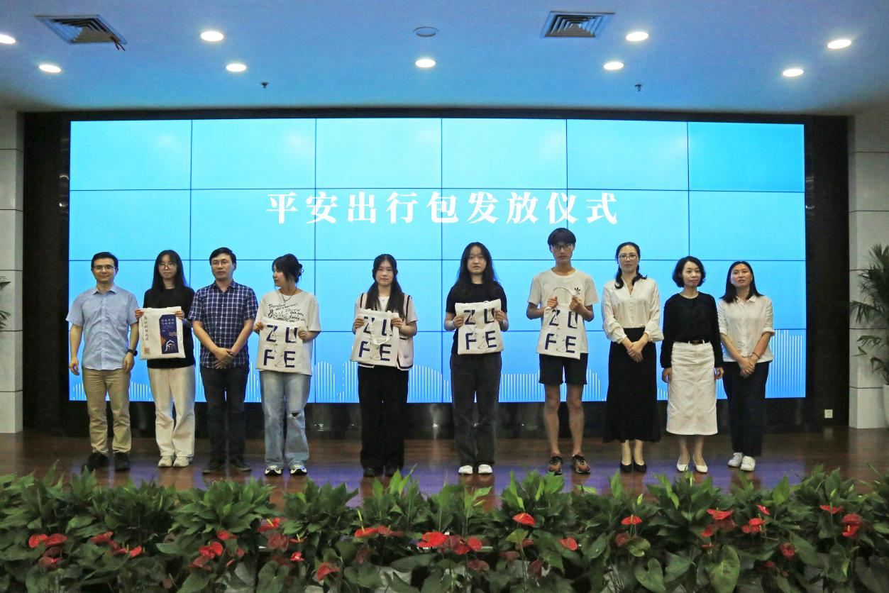 学生处、教务处、研究生院、计财处、保卫处等职能部门负责人为学生发放平安出行包。