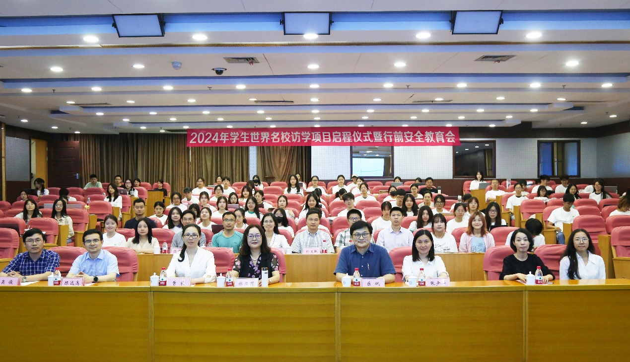 本网讯6月11日,学校举行学生世界名校访学项目启程仪式暨行前安全教育会。副校长郑亚莉主持会议并讲话。相关职能部门和学院负责人、项目带队教师及2024年下半年出国(境)留学学生等90余人参加会议。
