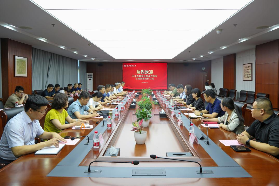 本网讯7月4日,天津市教育委员会网信办处长王振刚一行来校,围绕高校教育数字化和智慧教育建设工作等主题开展专题调研。天津市教育委员会相关工作人员以及天津市19所高校的网信办主任参加调研,副校长郑亚莉热情接待了来访客人。