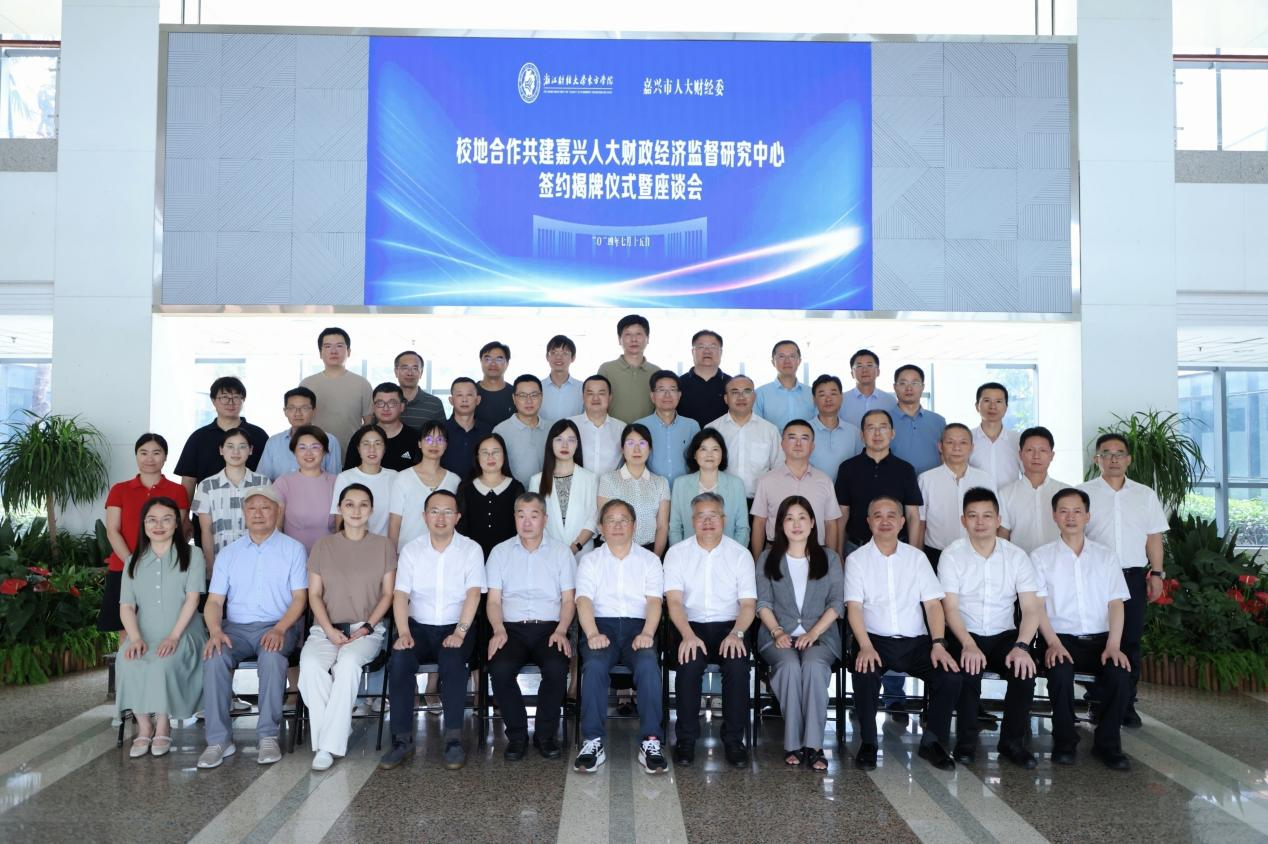本网讯7月15日,校地合作共建嘉兴人大财政经济监督研究中心签约揭牌仪式暨座谈会在东方学院举行。嘉兴市人大常委会副主任曹国良,学校地方财政研究院院长、原校长钟晓敏,海宁市人大常委会主任姚敏忠,嘉兴市人大财经委(预算工委)主任委员沈周明,嘉兴市社科联副主席孔翠,海宁市委常委、长安镇党委书记、高新区党工委书记马明浩,嘉兴市人大机关有关委室负责人,各县市区人大常委会分管副主任和财经委主任委员,海宁市人大办、市社科联、市发改局、市财政局和长安镇人大负责人等40余人出席。校党委委员、东方学院党委书记申屠莉,东方学院党政班子成员、研究中心成员代表,东方学院相关职能部门负责人参加活动。