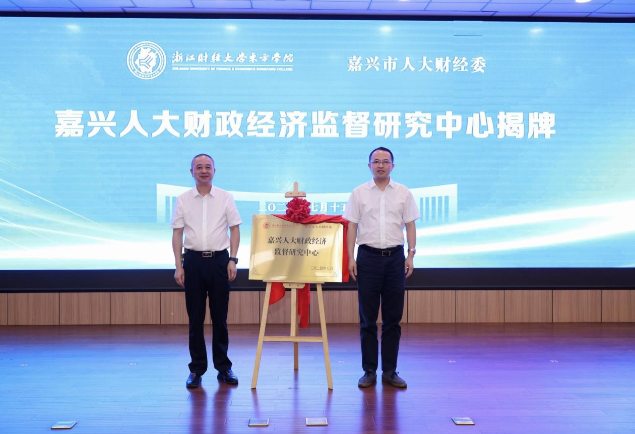 嘉兴市人大财经委(预算工委)主任委员沈周明、东方学院院长童志锋代表双方签订校地合作协议,并为嘉兴人大财政经济监督研究中心揭牌。仪式上童志锋还为研究中心学术委员会主任委员、委员和研究中心指导单位颁发聘书、授牌。