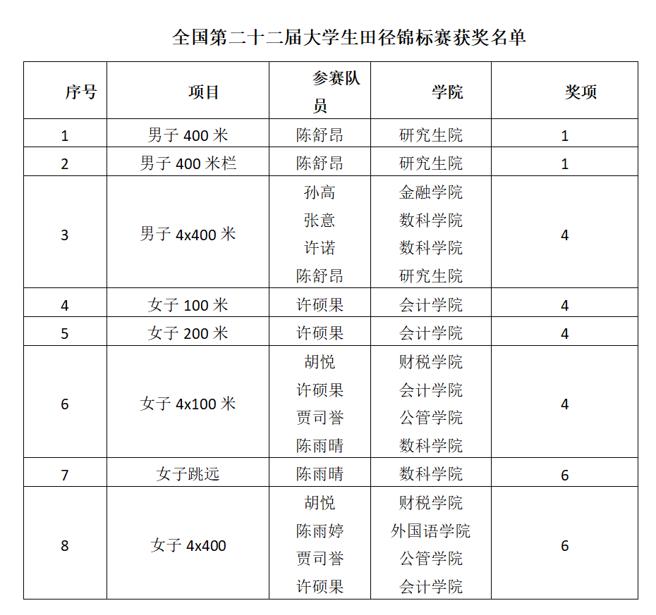 本网讯7月13日至20日,全国第二十二届大学生田径锦标赛比赛在福建省南平市举行。学校运动健儿奋勇拼搏,表现优异,夺得2金,并获甲组男子团体第三,女子团体第五,团体总分第五的优异成绩。陈舒昂获优秀运动员称号,赵凌强、吴艳获优秀教练员称号。