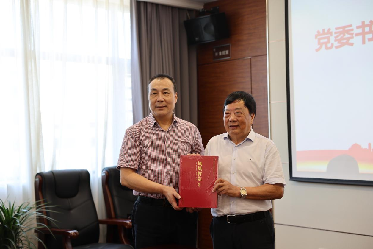会后,省劳动模范、凤凰村46年的领头雁胡岳法书记向学校赠送《凤凰村村志》。