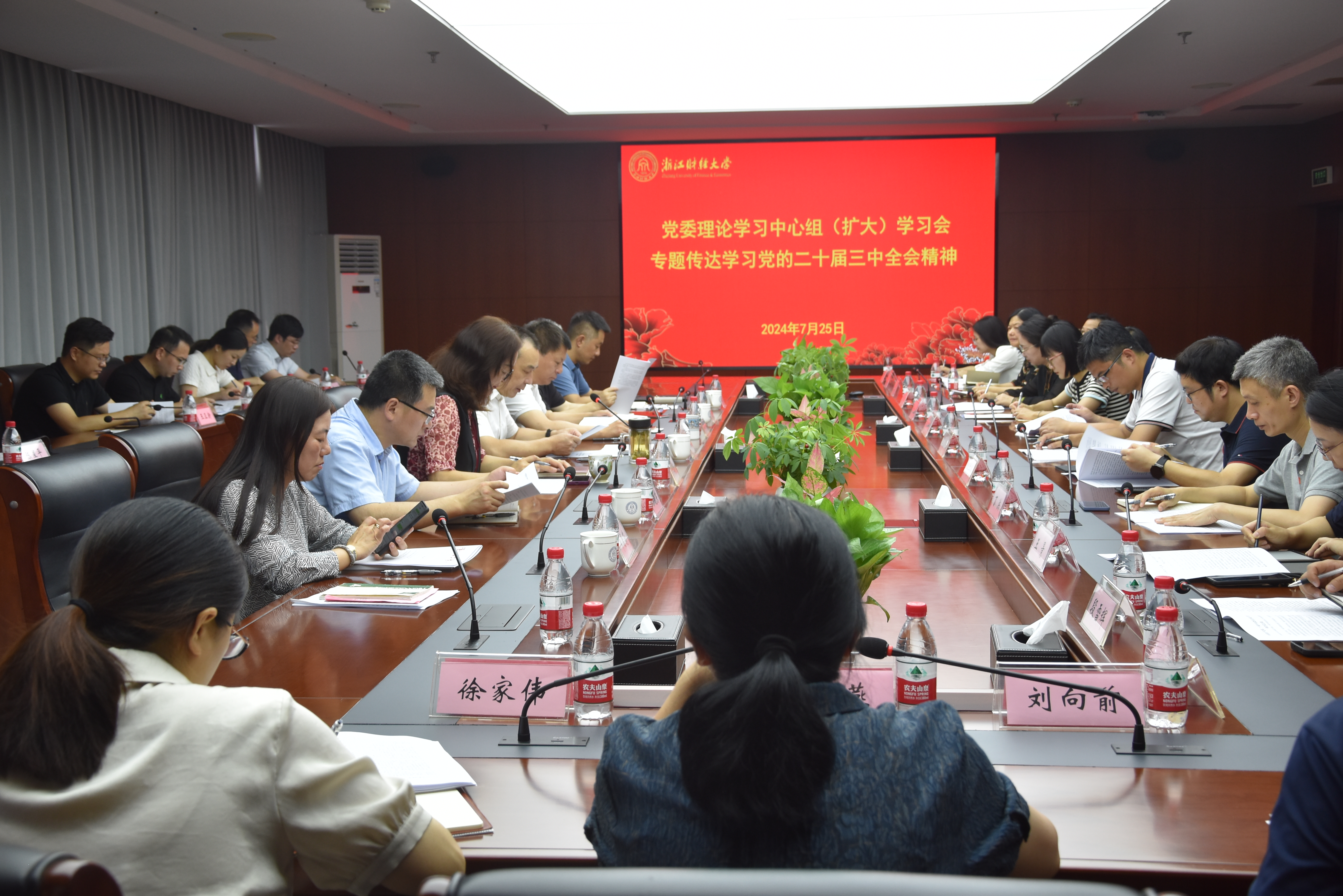 本网讯7月25日,学校召开党委理论学习中心组(扩大)会议,专题传达学习党的二十届三中全会精神,传达学习浙江省委常委会(扩大)会议精神,根据中央和省委部署要求研究学校贯彻落实意见。校党委书记李金昌主持会议并讲话。魏江、郑亚莉、孙旭东、徐晓东、程爽、申屠莉等校领导班子成员参加学习。学校党群部门主要负责人、二级党组织书记参加会议。