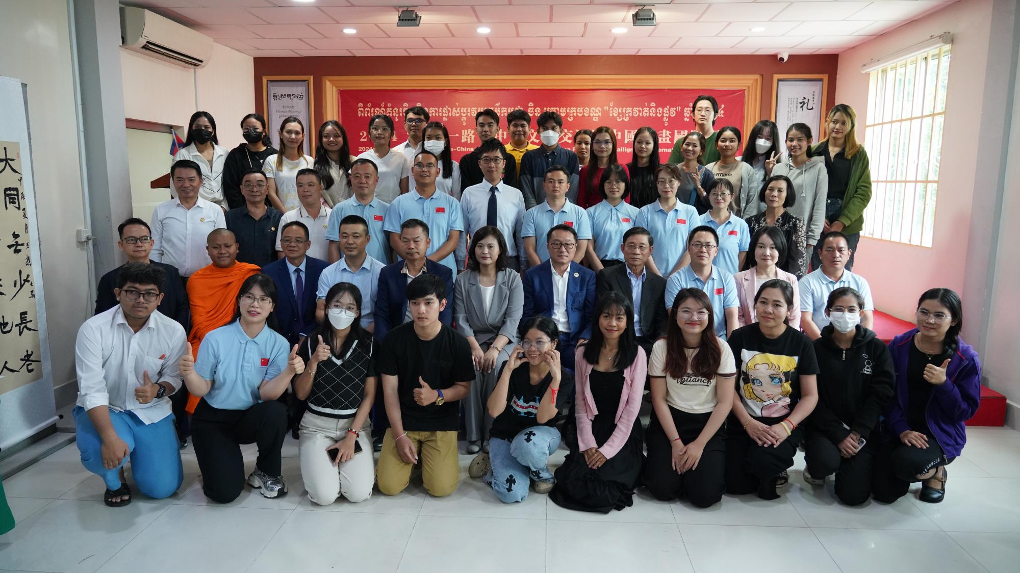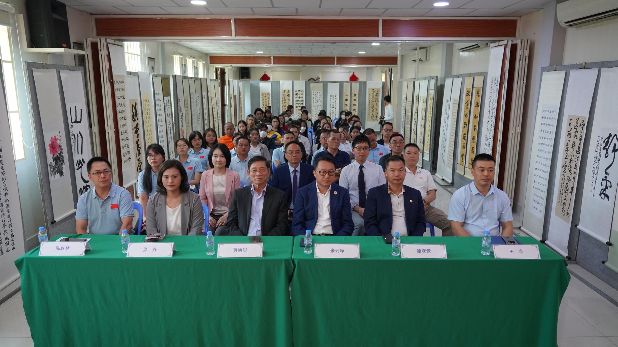 本网讯7月19日-20日,由我校与柬埔寨皇家科学院孔子学院、省书协、省教育书协联合主办的2024“一带一路”中柬文化交流暨中国书画国际展在金边柬埔寨皇家科学院孔子学院展厅隆重举行。人文与传播学院相关负责人、艺术学院教师代表参加活动。柬中友好协会副主席张云峰公爵、孔子学院中方院长王丰、世界文化产业交流联合会执行理事长毛宸恩、柬华理事总会常务副会长兼《柬华日报》社长黄焕明、柬埔寨广东商会会长康观景、第三批中国援柬埔寨中医医疗队长陈虹林及孔子学院师生、艺术家代表、金边市民、华人等百余人出席开幕式。本次活动是庆祝2024年7月19日中柬建交66周年纪念日的人文活动之一,《柬华日报》对此作了专题报道。