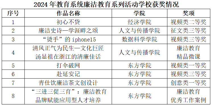 本网讯近日,省委教育工委公布“2024年教育系统廉洁教育系列活动”省级评选结果,我校推选的8个作品脱颖而出,获得表彰。