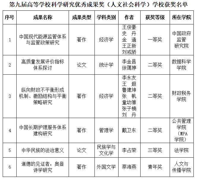本网讯近日,第九届高等学校科学研究优秀成果奖(人文社会科学)评选结果公布。学校在本届评选中6项成果获奖,成绩创历史新高,其中一等奖1项、二等奖3项、三等奖1项、青年奖1项。这是我校首次在高等学校科学研究优秀成果奖(人文社会科学)评选中获一等奖,实现了该奖项零的突破。