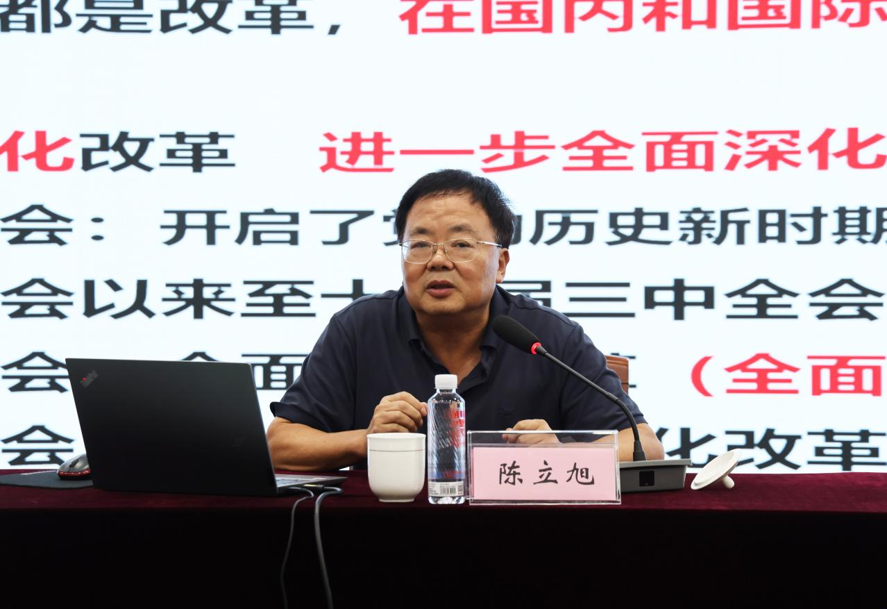 省委党校原副校长陈立旭作题为《以进一步全面深化改革推进中国式现代化》的辅导报告。他表示,党的二十届三中全会是中国共产党以高质量发展推进中国式现代化建设过程中召开的一次十分重要的会议,在新时代新征程上具有里程碑意义。他回顾了党的历次三中全会历史,从“改革、全面深化改革到进一步全面深化改革”“围绕中国式现代化主题擘画进一步全面深化改革”“党的二十届三中全会《决定》的基本框架和主要内容”“党的二十届三中全会改革战略部署的突出特点”等四个方面,对党的二十届三中全会精神作了深入阐释。