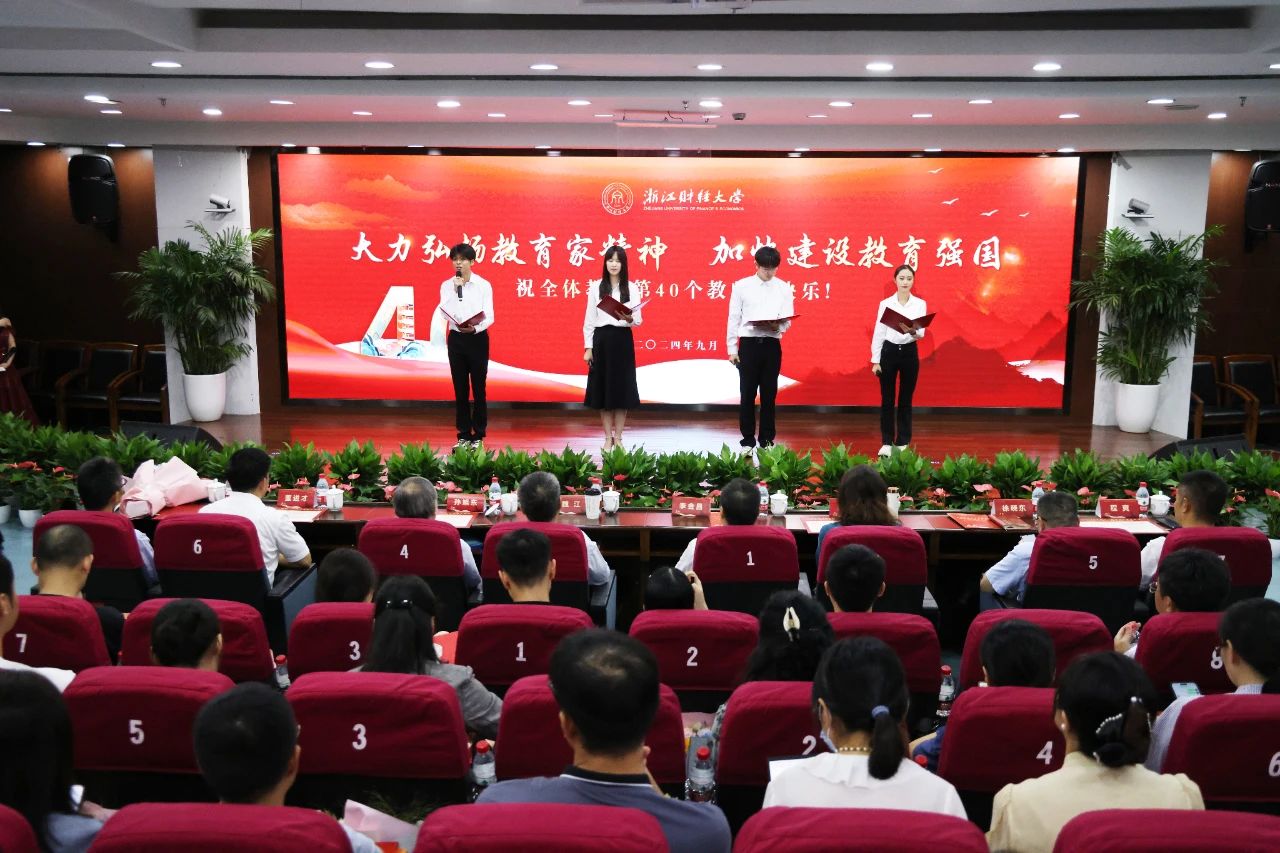 本网讯秋风送爽,丹桂飘香。9月10日,在第40个教师节之际,学校召开“大力弘扬教育家精神,加快建设教育强国”庆祝第40个教师节暨优秀教师表彰大会。校领导班子成员李金昌、魏江、郑亚莉、孙旭东、徐晓东、董进才、程爽、申屠莉出席。