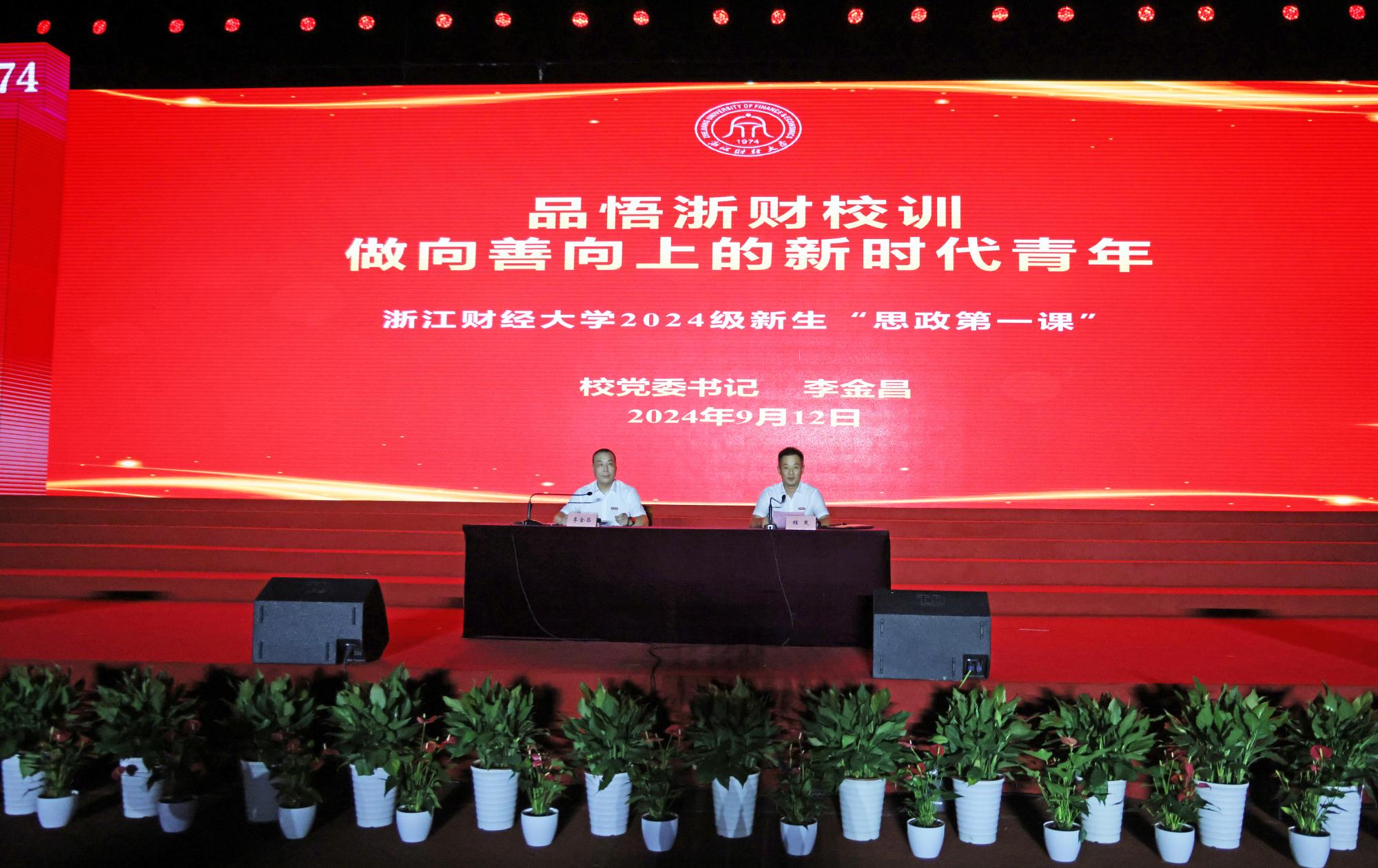 “再过50天,学校将迎来建校50周年校庆。学校的发展离不开同学们,你们与学校相互成就。”李金昌强调,学校之所以有如今的发展成绩,是历代浙财人筚路蓝缕、艰苦创业的结果,是浙财人内心深处建设特色鲜明的一流财经大学的坚定信念和崇实创新的精神气质。他阐释了“进德修业,与时偕行”的校训内涵,“进德修业”是做人之本,良好德行是成就任何事业的重要前提;“与时偕行”是为事之道,任何工作都必须坚持改革创新,因事而化、因时而进、因势而新。他鼓励同学们要深刻理解并践行浙财校训精神,他表示,浙财精神和校训深深影响着每一位浙财人,充满着学校对每位学子的殷切期望和深沉关怀,激励大家形成向上的力量、向善的力量。