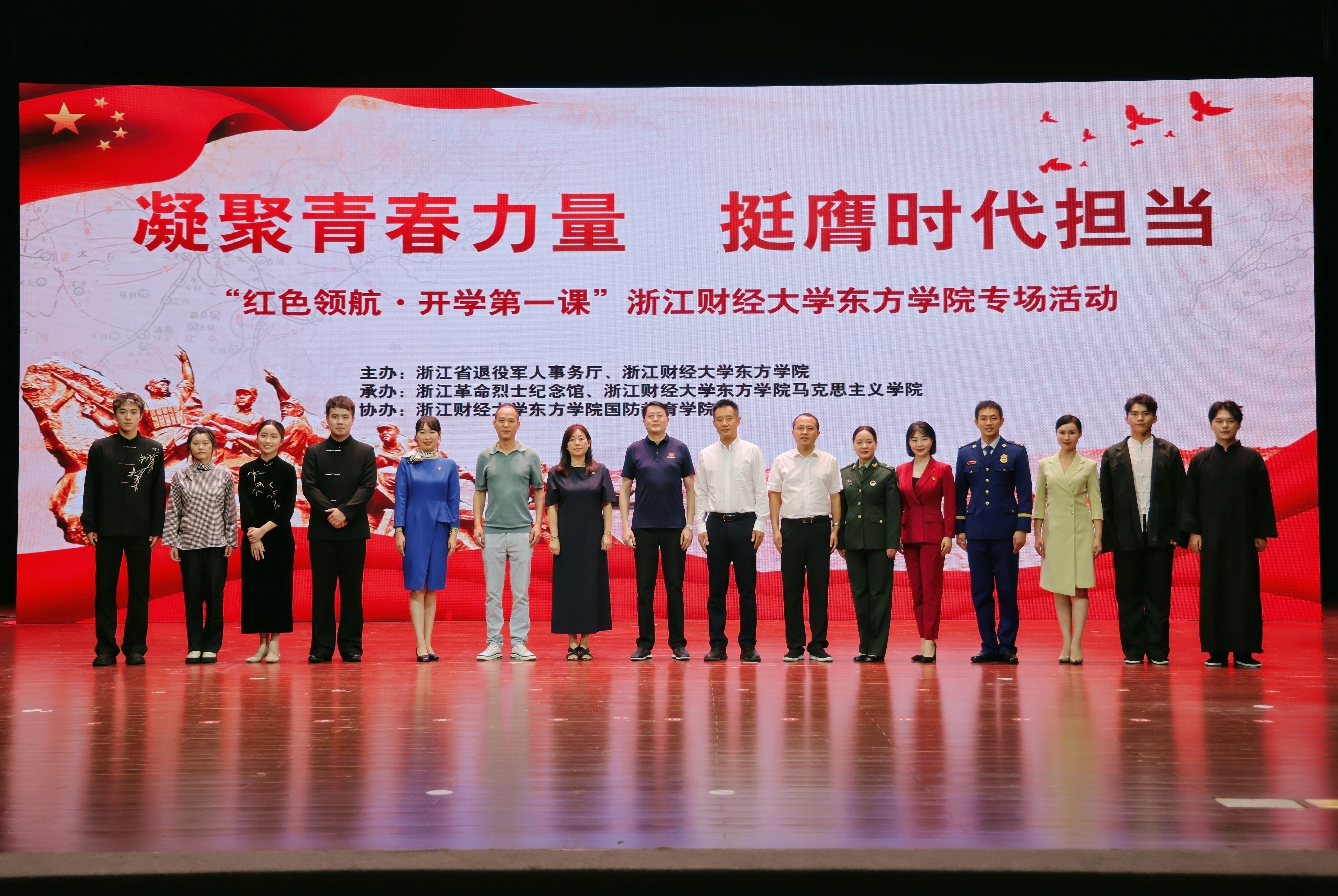 本网讯9月12日,由浙江省退役军人事务厅与ued体育 东方学院主办的“凝聚青春力量 挺膺时代担当——‘红色领航·开学第一课’”主题专场活动在东方学院举行。浙江省退役军人事务厅党组成员、副厅长周剑,校党委副书记程爽,浙江革命烈士纪念馆相关领导,东方学院领导班子成员,各二级党组织书记及党群部门负责人、教师代表及2024级新生代表参加活动。