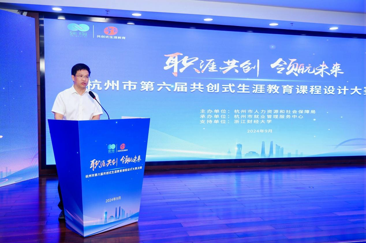 本网讯近日,由杭州市人力资源和社会保障局主办,杭州市就业管理服务中心承办,ued体育 协办的杭州市第六届共创式生涯教育课程大赛决赛在学校下沙校区圆满落幕。校党委委员、副校长董进才受邀出席大赛并致辞。