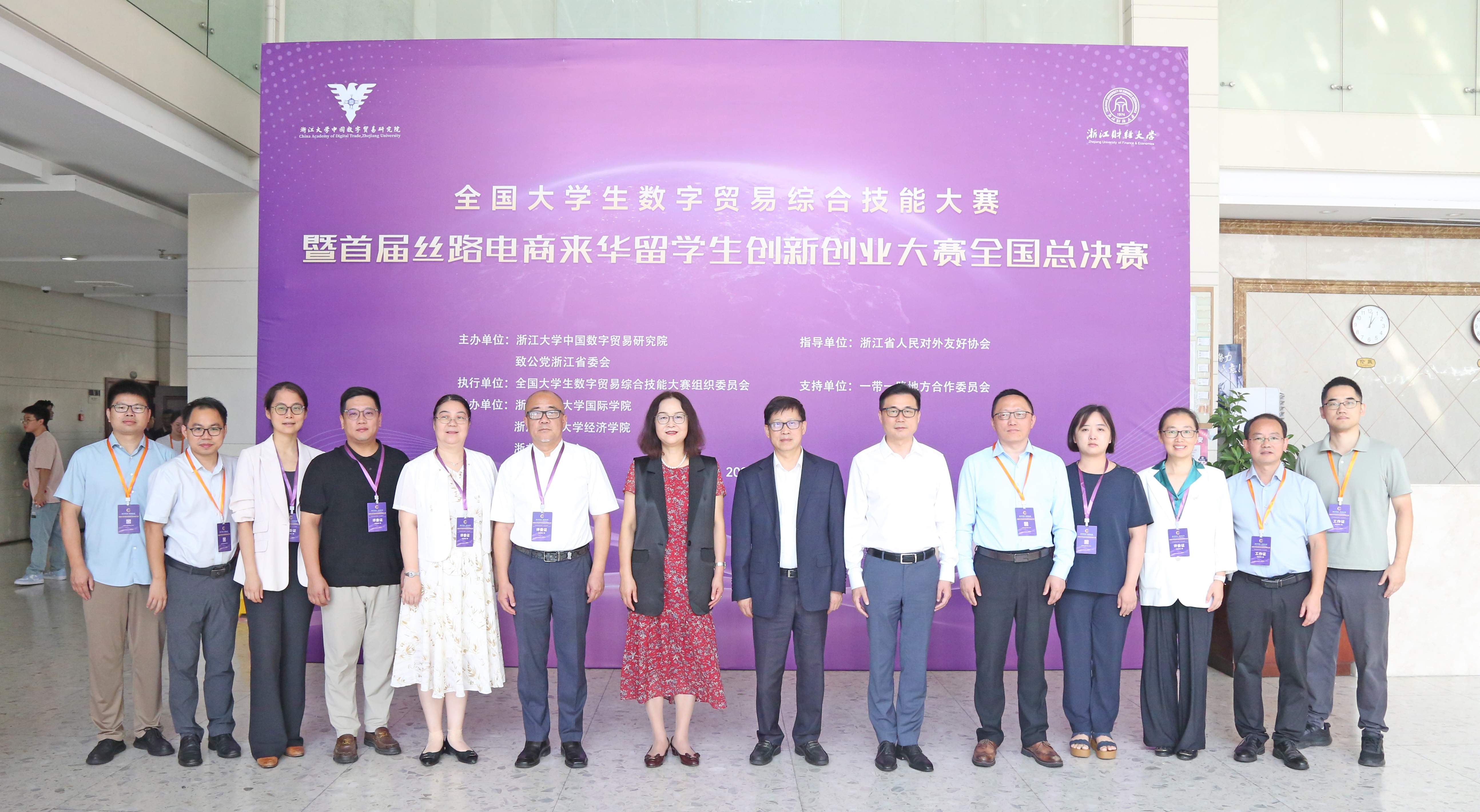 本网讯9月28日,第三届全国大学生数字贸易综合技能大赛暨首届丝路电商来华留学生创新创业大赛全国总决赛在学校下沙校区举行。浙江省人大常委会委员、致公党浙江省委会副主委裘云庆,全国政协委员、副校长郑亚莉,全国大学生数字贸易综合技能大赛秘书长易建安出席总决赛开幕式。