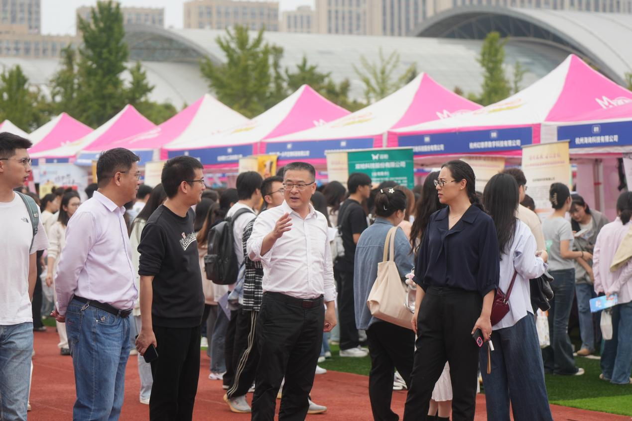 本网讯10月17日,2025届毕业生秋季综合招聘会在下沙校区举行。校党委副书记徐晓东来到招聘会现场看望慰问用人单位代表,了解用人需求,并与毕业生交流就业落实情况。相关职能部门负责人、各学院分管学生工作负责人和毕业班辅导员等悉数到场,积极向用人单位推荐毕业生。